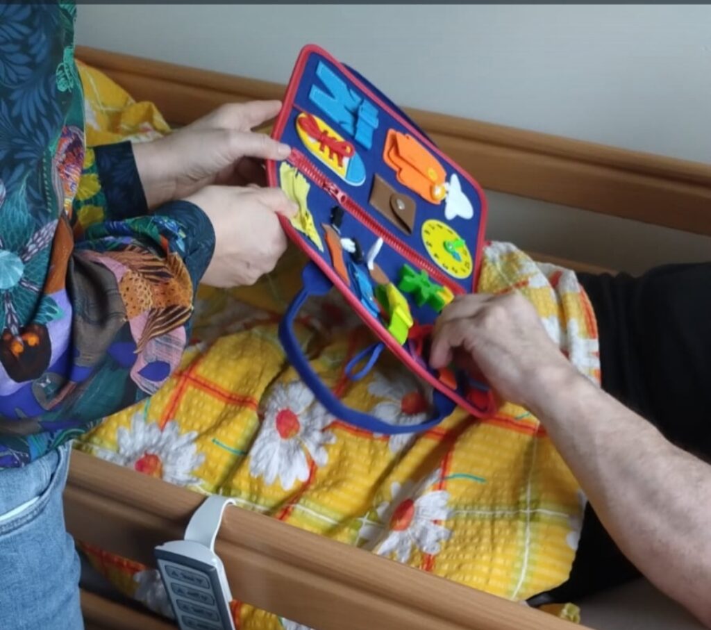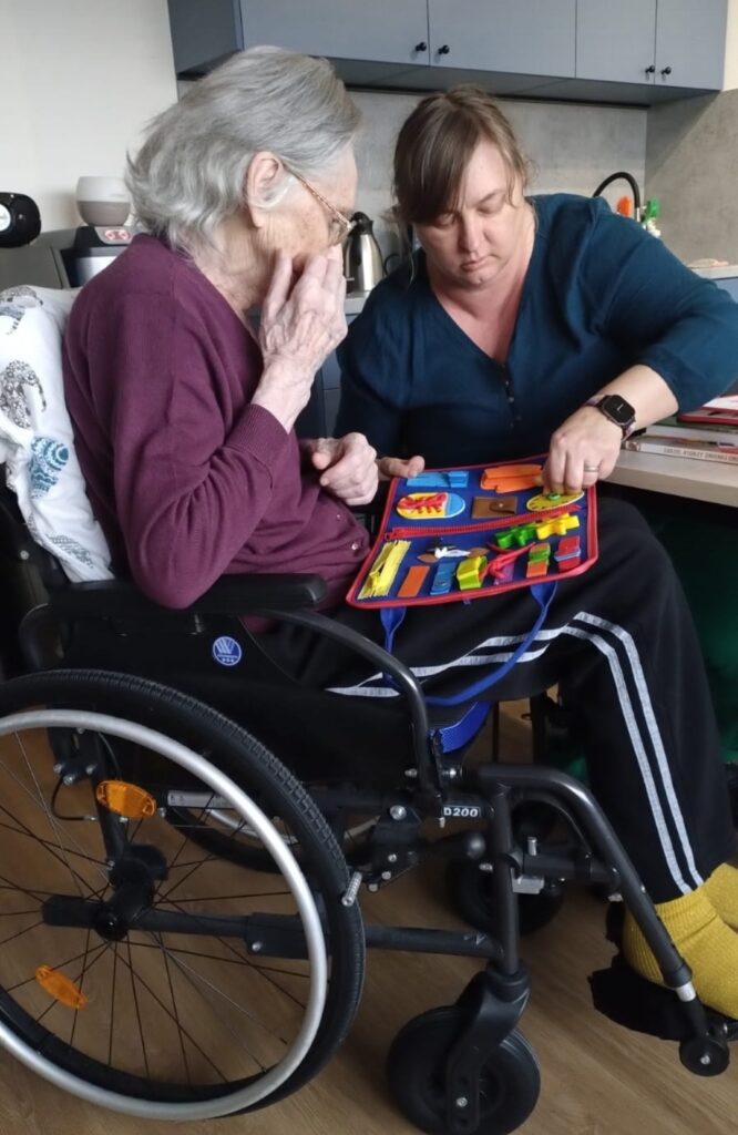 🫶 Pan Stanisław i pani Bronisława z dużym zaangażowaniem wzmacniali pracę swoich dłoni oraz umysłu wykonując ćwiczenia przy pomocy książki sensorycznej. 📖