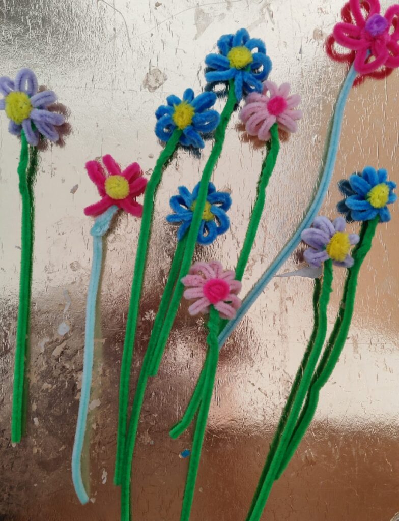 Wspólnymi siłami wykonaliśmy kolorowe kwiatki i kiedy tylko umieściliśmy je na naszym stole przez okno zaczęło zaglądać słońce.